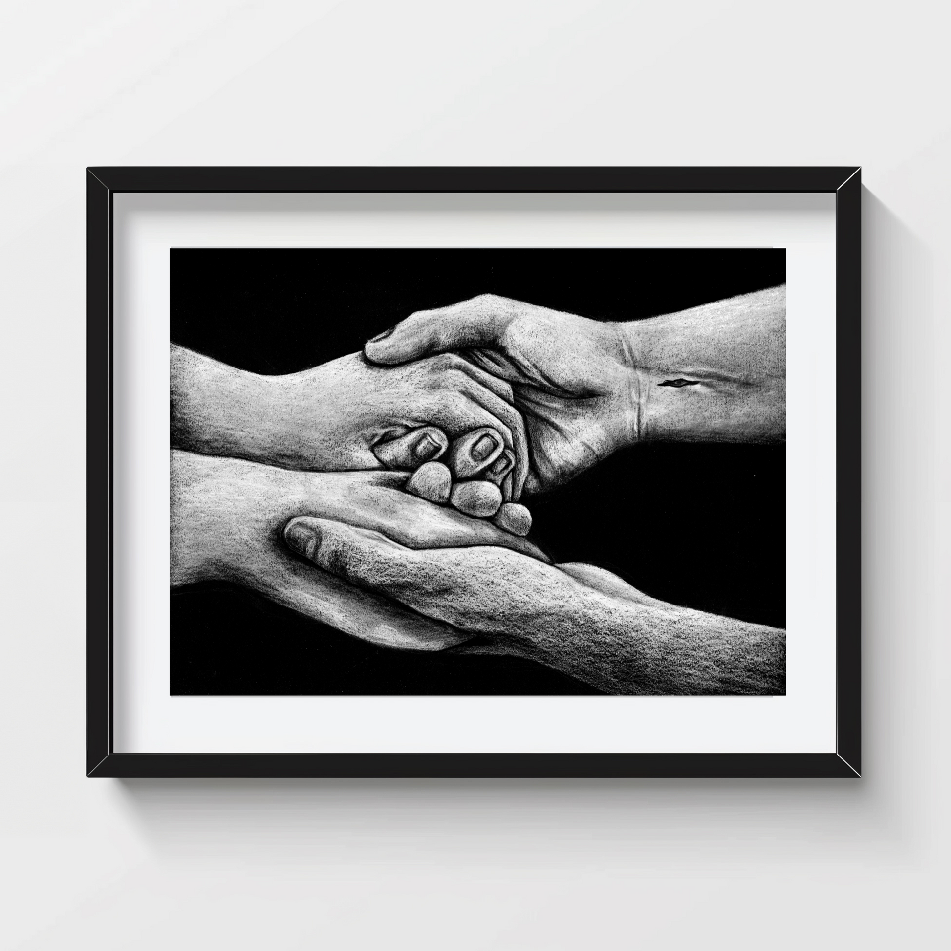 This drawing, ‘Be Still’, is intended to be a visual representation of the reliance we can have in being still with Christ. Both hands in the Savior’s, constant and sure in His strength. Resting in consistency, both in our own efforts and in the power and knowledge of who He is. I hope that this drawing can be a reminder to give ourselves the grace to be still.